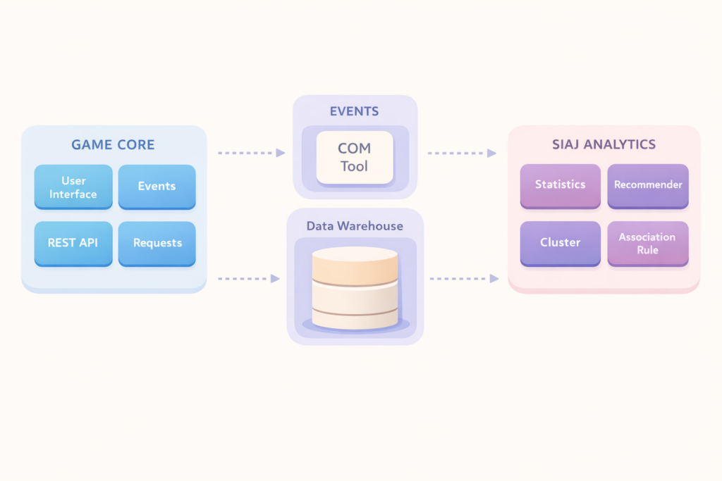 GameCore was the central hub: it managed data for clients (publishers), players, and games, and provided two web portals. The publisher portal allowed creating, customising, publishing, and managing games, and accessing statistics and data mining results. The player portal let users explore available games, play, access their profile, and view leaderboards. Games were built in HTML5, CSS3, and JavaScript, structured in three segments: Option Selection (optional), Target Questions (optional but critical for data mining), and the game itself. The GameCore API was REST-based, with JSON responses and JSONP support for cross-domain use.